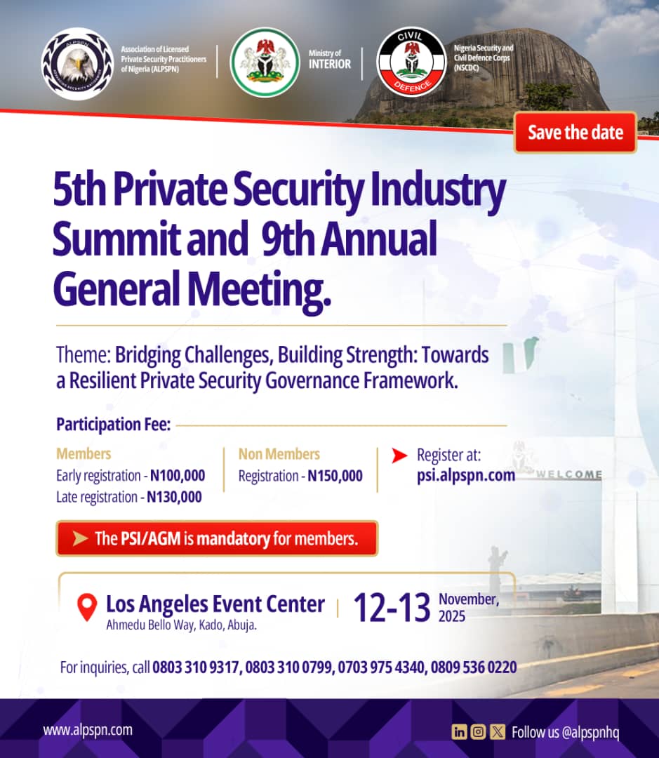 The Association of Licensed Private Security Practitioners of Nigeria (ALPSPN) in partnership with the Nigeria Security and Civil Defence Corps (NSCDC) presents the most comprehensive gathering of security professionals in Nigeria.